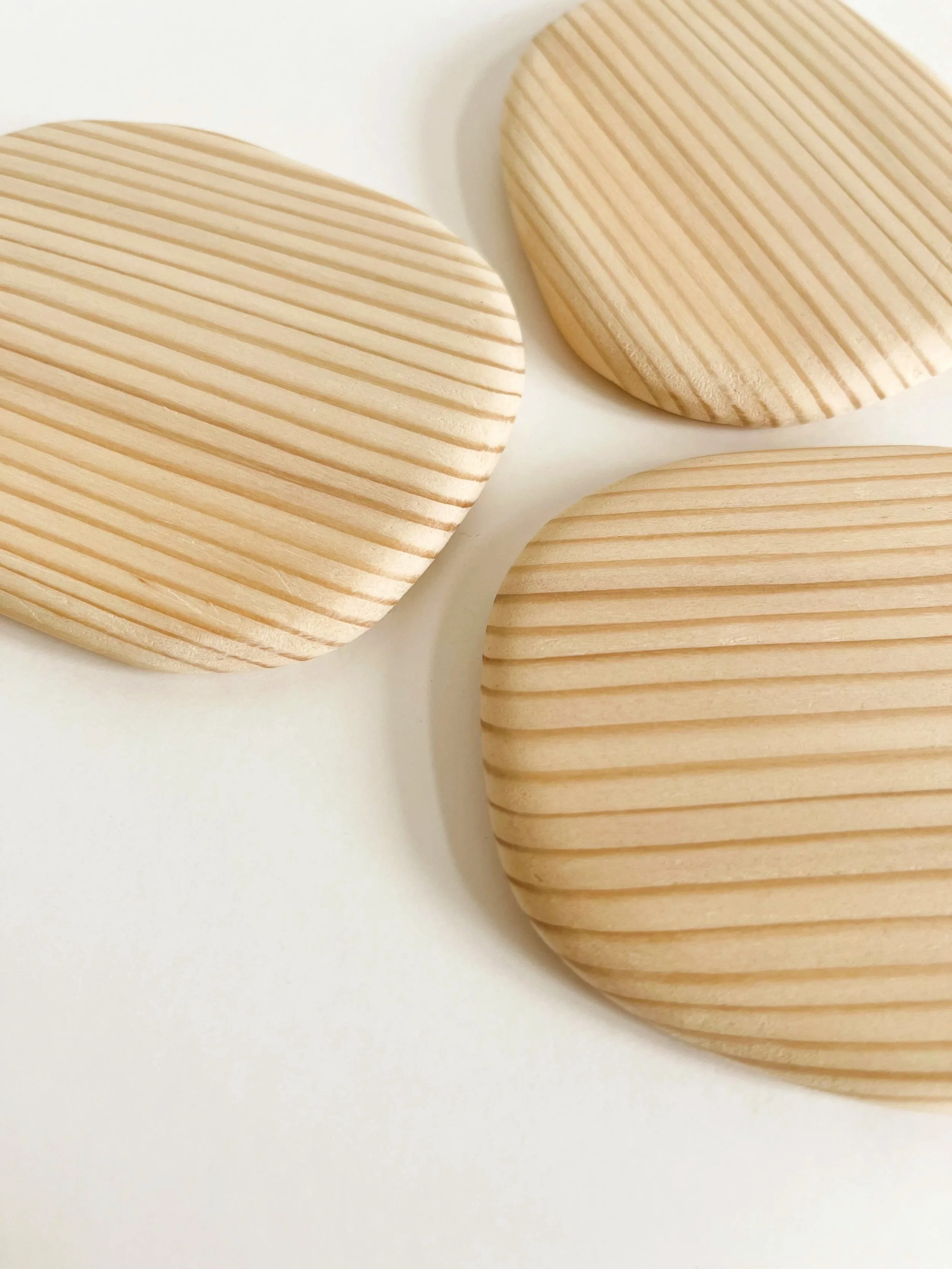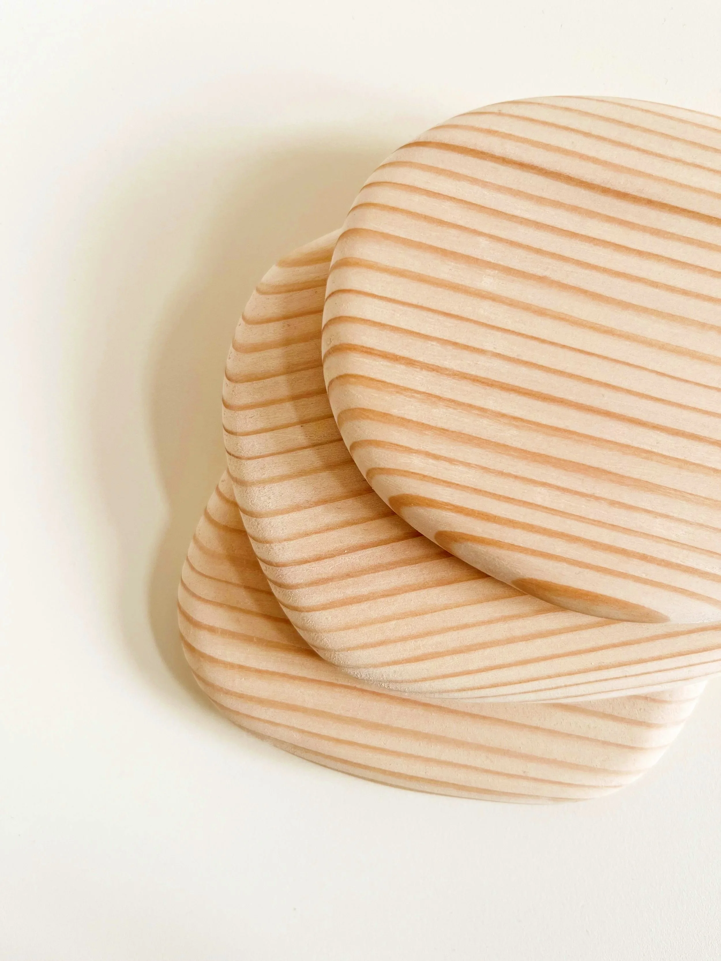 Die Untersetzer gibt es als 3er-Set. Sie sind aus einem recycelten Fichtenholz-Brett entstanden. Ich habe sie frei zugesägt. Daher ist jeder Untersetzer etwas anders in der Form.
